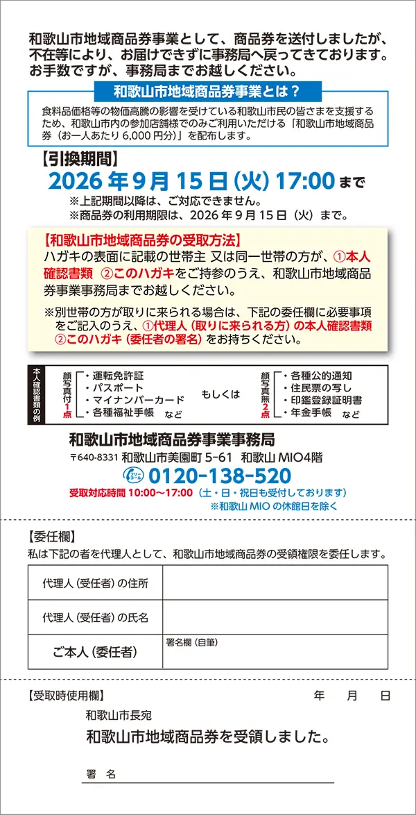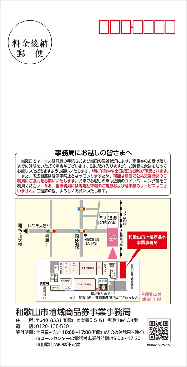 通知書が届いた方は、内容をご確認のうえ、和歌山市地域商品券事業事務局(所在地は下記のとおり)まで商品券を受け取りにお越しください。